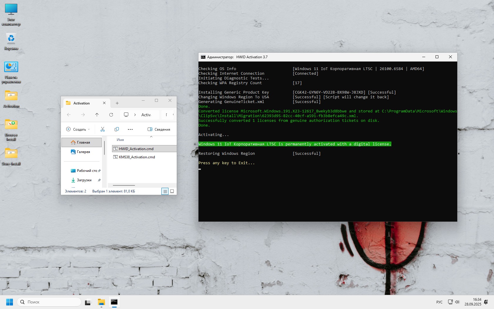 На рабочем столе — папка Activation с последним MAS, чтобы не бегать по мутным сайтам. Телеметрия отключена глубже, чем обычно — система работает только на тебя, а не на корпорации.