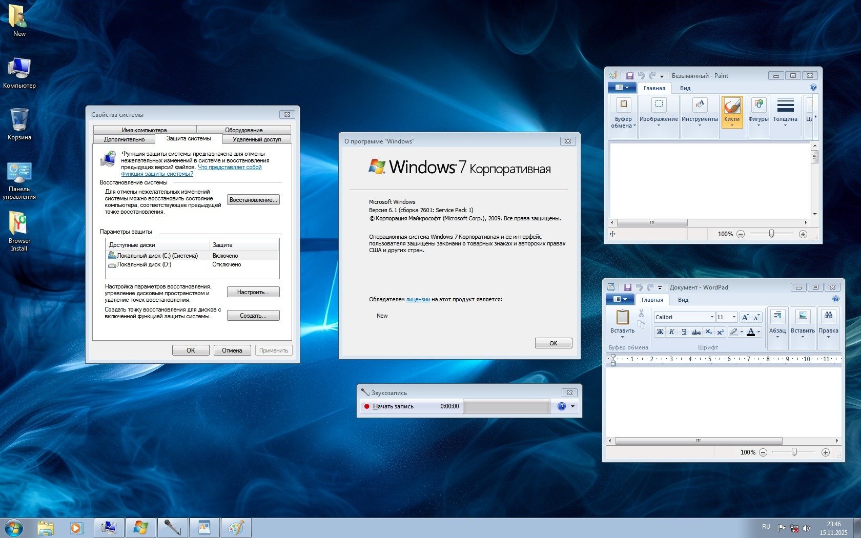 На нём уже присутствуют основные ярлыки: «Компьютер», «Панель управления», папка пользователя и корзина — можно сразу приступать к работе. -
