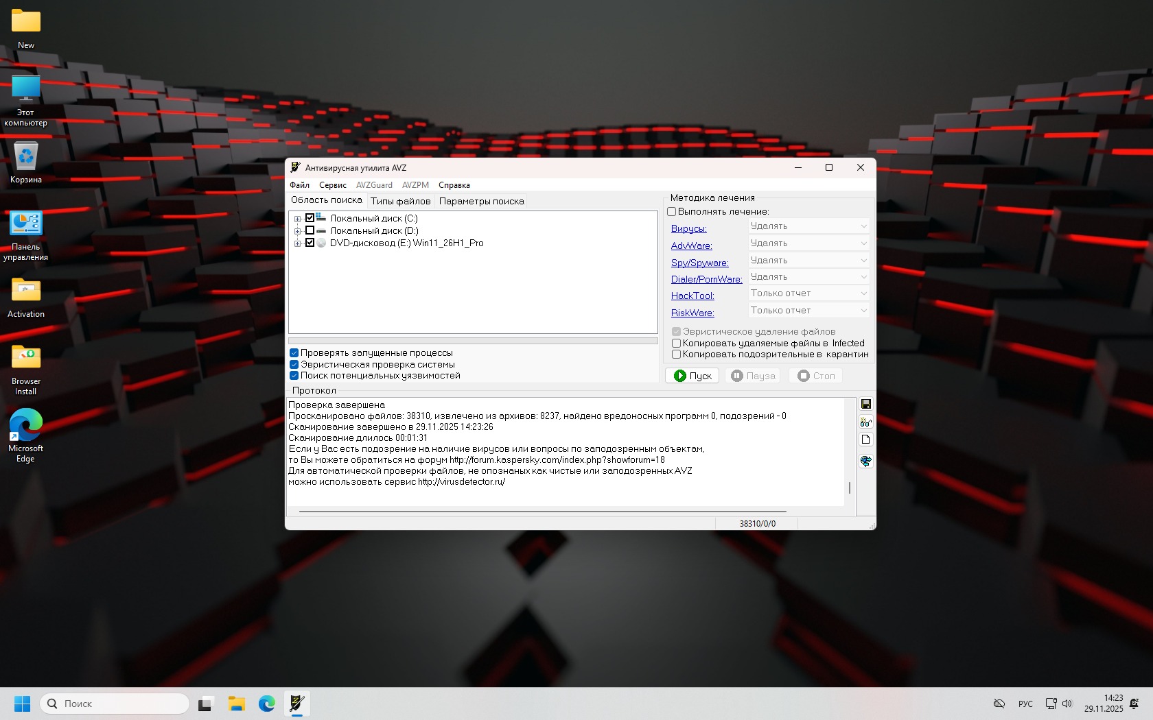 Сборка аккуратно настроена под производительность и комфорт: выключены Defender, UAC, SmartScreen, изоляция ядра и старые аппаратные фиксы, оставлены Edge и OneDrive из-за их глубокой системной интеграции. Убрана телеметрия, лишние задания Планировщика и фоновая «суета», интерфейс доработан по мелочам, контекстное меню классическое, кнопка «Пуск» слева. Это не «обрезок», а цельная система с низкой степенью урезки и высокой стабильностью.