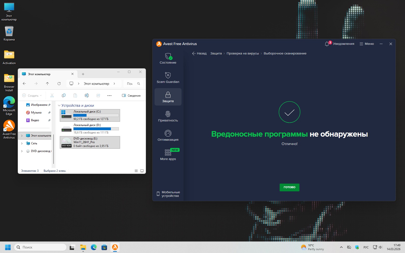 В системе работает Windows Defender — штатная защита Microsoft без необходимости устанавливать сторонний антивирус. |