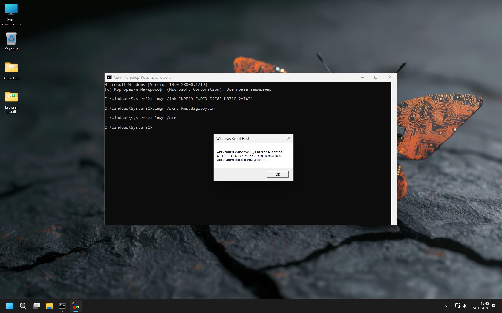 ВНИМАНИЕ! Рекомендуем устанавливать сборку при отключенном Интернете и использовать предложенный на Рабочем столе метод KMS-активации (в командной строке).