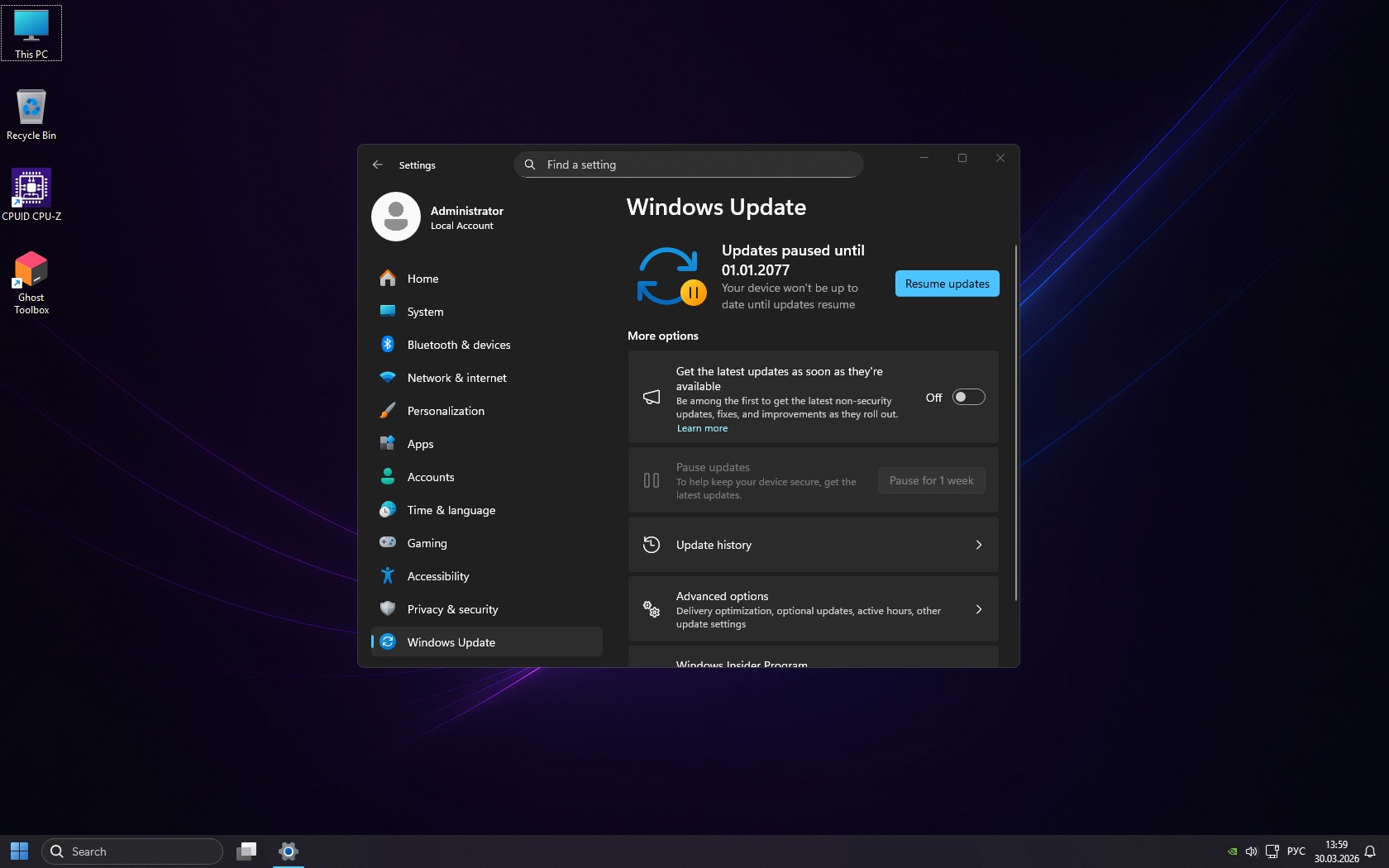 Кроме того, сборки Ghost Spectre обладают оптимизированным файлом подкачки, службами и планировщиком задач, что снижает нагрузку на систему и ускоряет отклик приложений. Вы можете полностью контролировать обновления Windows, приостанавливать их на длительный срок, а также использовать настраиваемые темы и пакеты иконок, чтобы сделать интерфейс персонализированным. В итоге Ghost Spectre — это идеальное сочетание минимализма, скорости и удобства, подходящее как для новичков, так и для продвинутых пользователей, которые ценят эффективность и стабильность.
