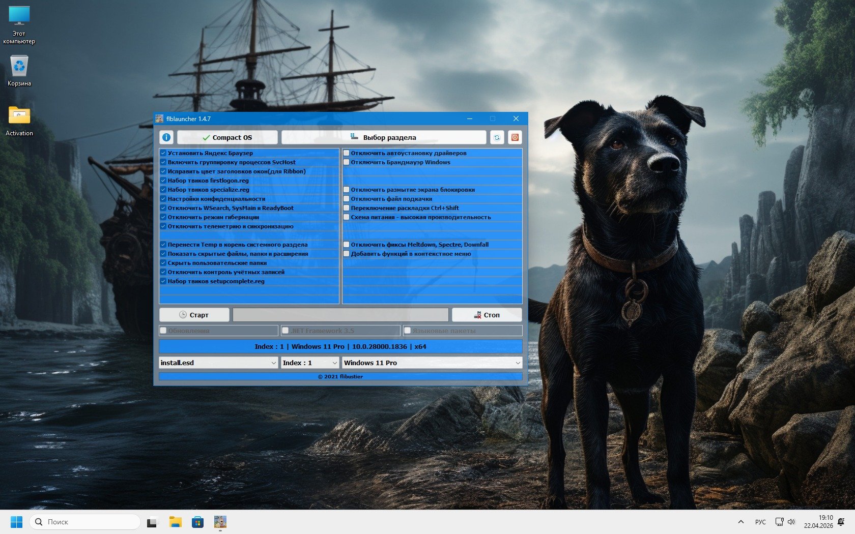 Лаунчер Flibustier даёт полный контроль над установкой и настройкой Windows 11 Pro 26H1. Доступны автоматическая установка программ, наборы твиков и сценарии на разных этапах установки. Процесс установки упрощён и требует от пользователя минимум действий.